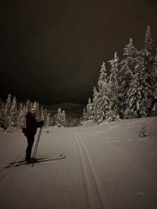 Løypa er merket med refleksbånd som lyser opp når hodelykten treffer – noe som gir en helt spesiell stemning i vintermørket. Dette er en annerledes og sosial trimtur som garantert gir både ro og energi!